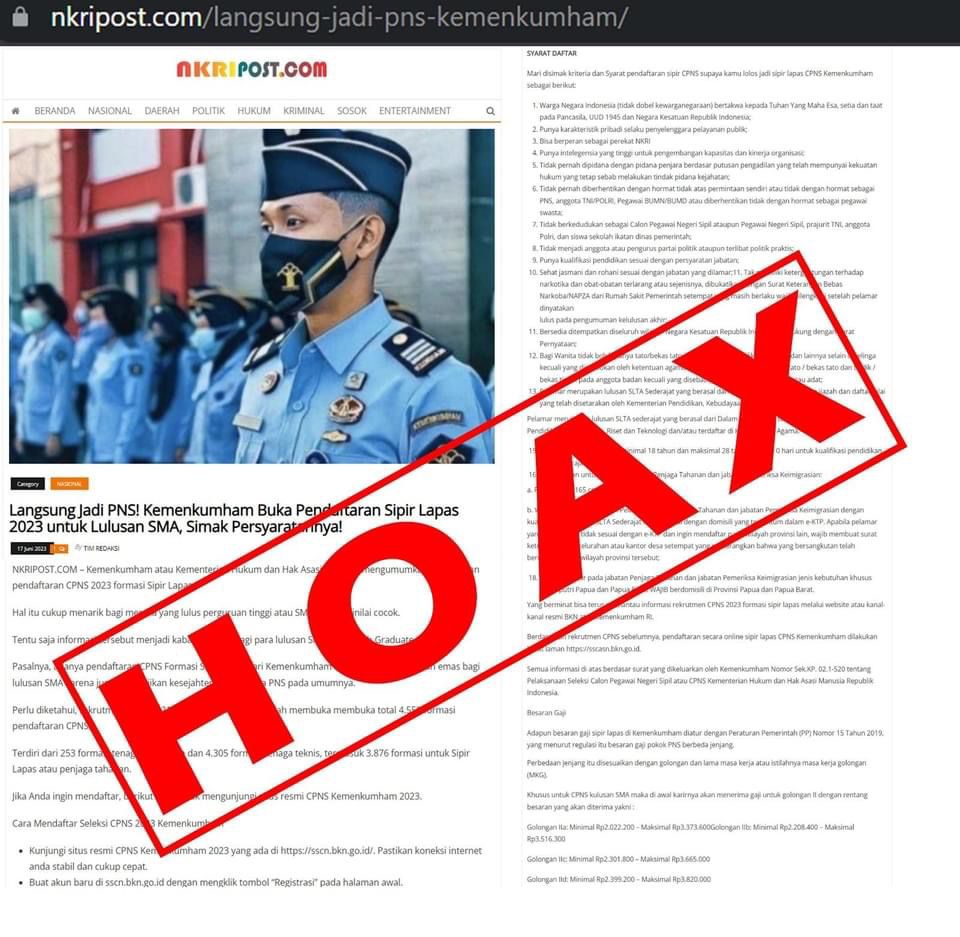 NASIONAL, Jakarta – Kementerian Hukum dan Hak Asasi Manusia (Kemenkumham) hingga saat ini, Minggu, 18 Juni 2023, belum membuka penerimaan Calon Pegawai Negeri Sipil (CPNS) Tahun 2023 di lingkungan Kemenkumham. Sehingga dapat dipastikan, berita tentang pendaftaran sipir lapas tahun 2023 untuk lulusan SMA, beserta persyaratannya adalah tidak benar/hoax.