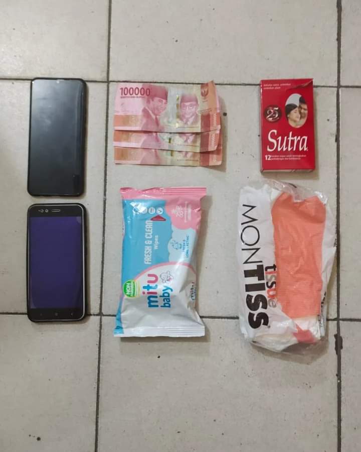 Selanjutnya Tim Opsnal mendatangi pelaku dan melakukan pemeriksaan terhadap pelaku dan tim opsnal menemukan Alat Kontra Sepsi (Kondom merk Sutra Warna Merah) yang hendak dipakai pelaku dan juga uang tunai sebesar Rp. 300.000,- (tiga ratus ribu rupiah) sebagai uang tips dari tamu /pelanggan.